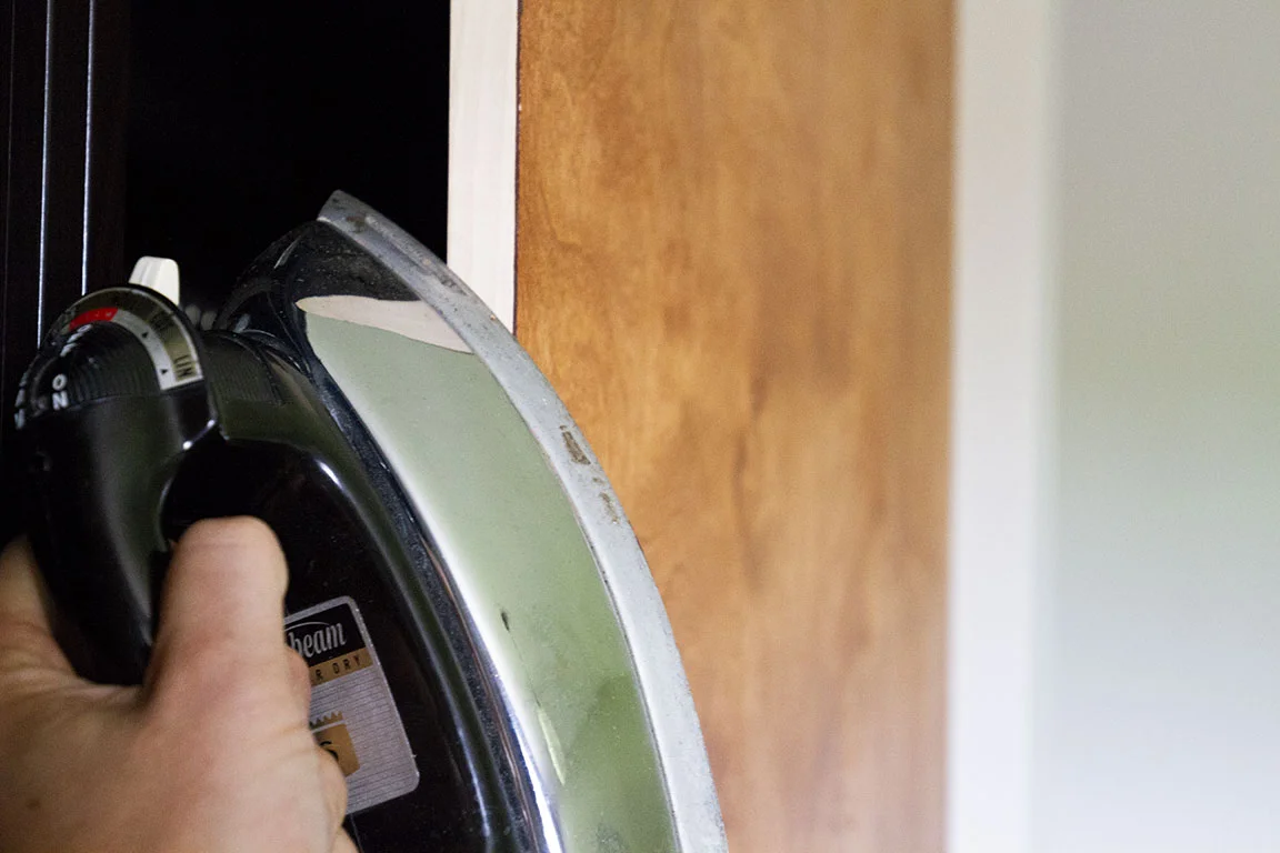 I purchased (4) 3/4" 4x8 sheets of birch veneer plywood and cut them to 28"x80", leaving just a minimal gap at the bottom for a clean, finished look. At first, I had intended to simply stain the sides of the plywood, but the exposed layers of wood were difficult to stain, leaving little gaps and pits of unfinished wood visible along the sides. I thought I could live with it, so I hung the doors as they were. As a few days passed, I realized this wasn't up to par and needed to be corrected. So, to cover the unfinished edges, I used a 3/4" iron-on birch veneer band. Ironing on the veneer would have been a lot easier to apply while the doors were laying flat, but I'm chalking this up to a lesson learned. Once glued in place, the veneer was trimmed, sanded, stained and oiled to match the door surface. This is the same stain used on the living room partition wall and original kitchen cabinets. As a result, I'm much happier with the finished edges, and I think the closet feels that way, too.