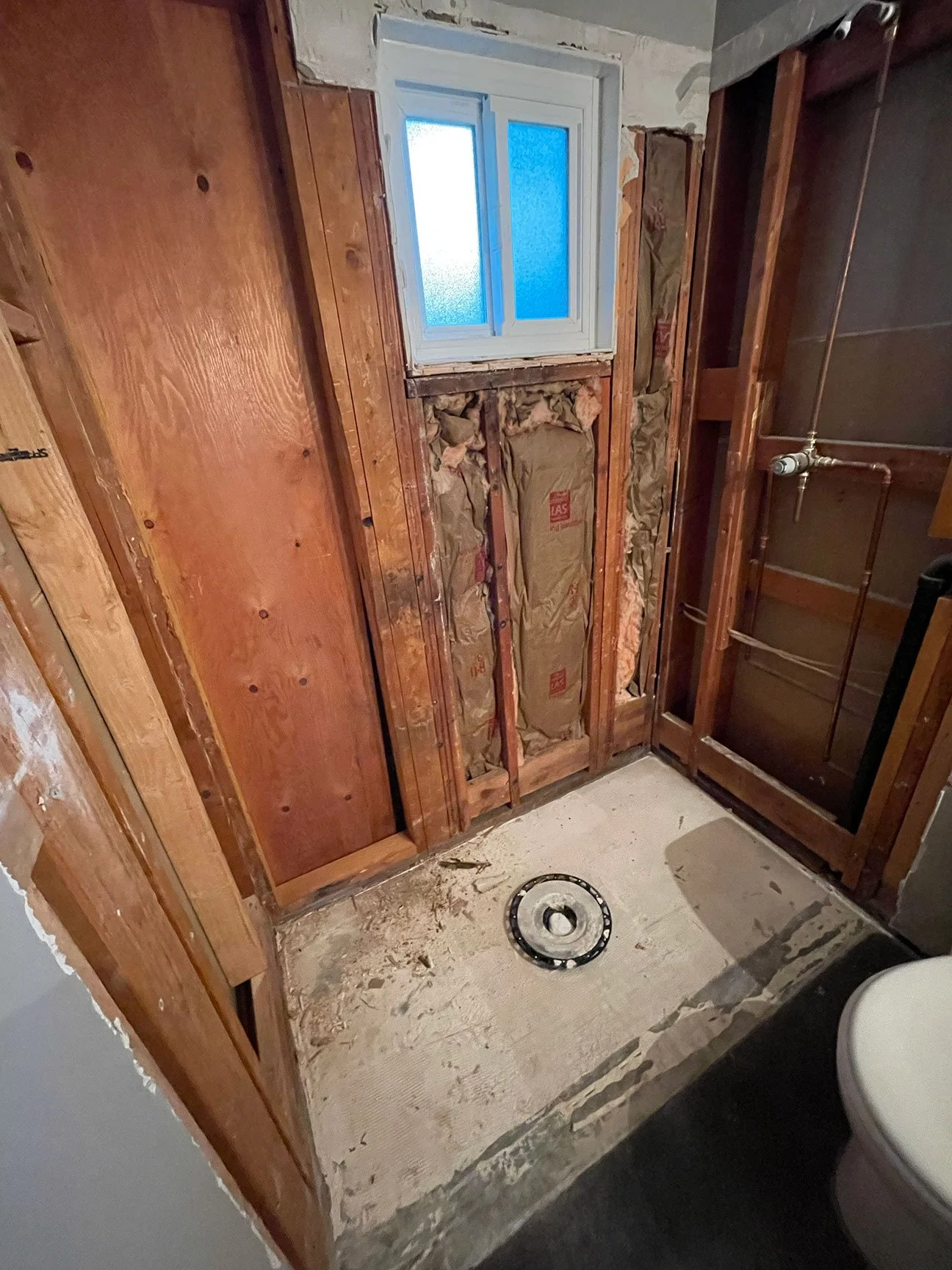 Over the course of a couple days of intense crowbar and hammer sessions, Glen and I got the shower enclosure down to the studs, cleaned up, and ready for the next phase of demo — the shower floor.
