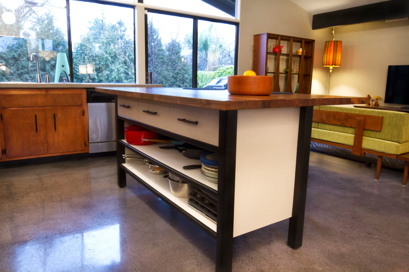 The legs and shelf fronts were painted the same black as the interior/exterior ceiling beams, while drawer fronts and side panels were painted the same gray as the interior wall color. Matching hardware was installed on the drawers and a brand new, 2-inch thick walnut slab was installed on the top. While this may not be my permanent solution for the kitchen island, it functions quite well, and the look is bright, modern and airy. For the cost of a new countertop ($270) and a little elbow grease, this piece of furniture has new life breathed into it, and I use it every day.